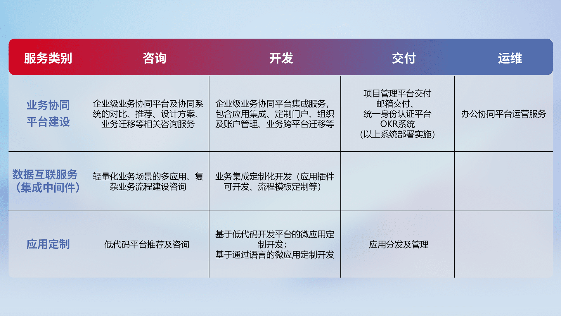 针对钉钉、、、、企微、、、、IDaas等平台级产品提供产品的规划、、、、方案、、、交付、、、、定制化开发等服务,,,,实现如统一协同办公、、、智能客户服务、、、、混合会议管理、、智能数据查询、、、、等业务场景,,,实现数字化转型。。